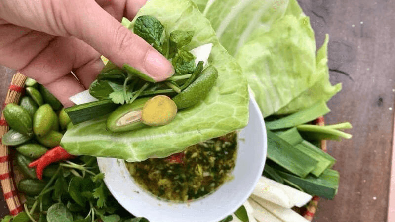 Bắp cải cuốn nhót xanh chấm chẩm chéo là món ăn đơn giản nhưng lại mang đậm hương vị Điện Biên. Vị chua của nhót xanh, vị cay nồng của chẩm chéo và vị ngọt mát của bắp cải tạo nên một sự kết hợp hoàn hảo, kích thích vị giác.